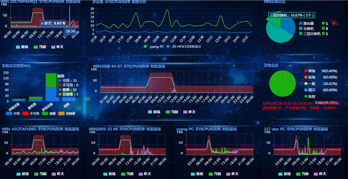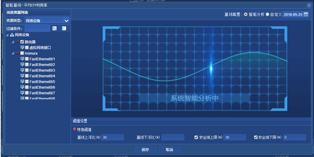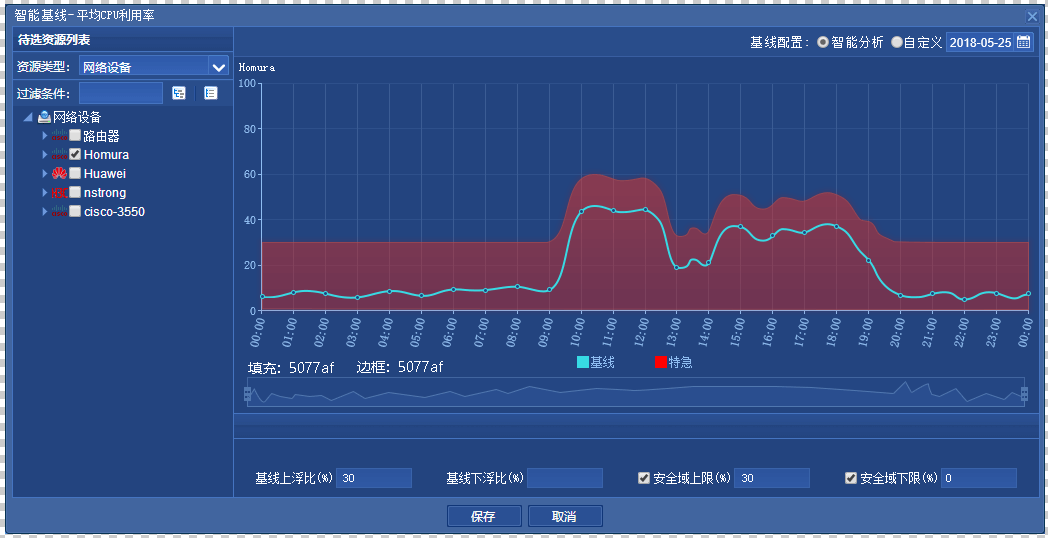 智能动态基线,将根据历史数据进行大数据分析自动生成,降低您的配置成本。同时支持人为的调整,根据基线%上下浮动,提供最低上浮门限数据,给空闲时间段的基线部署合理的安全范围,主动式的规避可预见问题。并可自由选择指定日的历史数据,从而杜绝无效数据告警,达到个性化配置的需求。